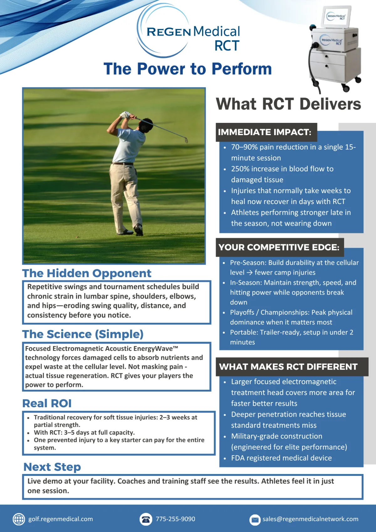 Elite tour professionals and serious golfers are turning to Regenerative Cellular Technology (RCT) to maintain their edge – accelerating recovery from lower back strain, elbow tendinitis, and shoulder overuse. It's a cutting-edge, non-invasive therapy that uses Focused Electromagnetic Acoustic EnergyWave™ to supercharge your body's own healing so you can play more rounds, swing with confidence, and extend your competitive years.